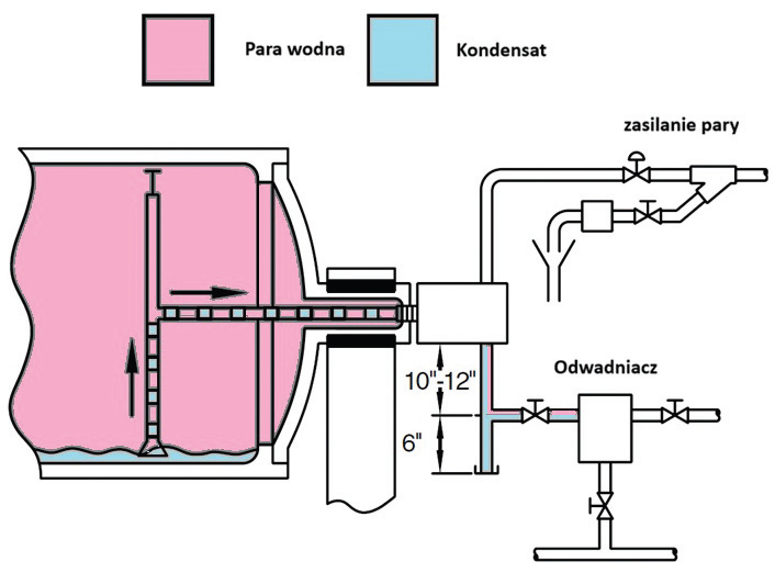 Wracając do sedna, czyli do rozważanych przez nas korków parowych, problem ten nie tylko dotyczy suszarek bębnowych. Czasem korki parowe powstają w wyniku błędów instalacyjnych. Oczywiście najczęściej dotyczy to rur pionowych przed odwadniaczem. Jeżeli odprowadzenie kondensatu zaprojektowane jest tak, że para wraz z kondensatem musi napływać pionowo do góry do odwadniacza, istnieje duże prawdopodobieństwo, że napotkamy na problem korków parowych. Wynika to z tego, że para ma niższą gęstość niż kondensat, więc jako pierwsza dotrze do odwadniacza, powodując zamknięcie układu zaworowego.