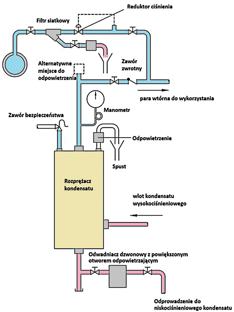 Kwestia wytypowania odpowiedniego miejsca montażu rozprężacza również jest istotna. Wszak celem jest odzyskanie jak najwięcej pary wtórnej kosztem minimalnych długości rurociągów. Ponadto rurociągi kondensatu, rozprężacz i rurociąg pary odzyskanej – niskociśnieniowej powinny być zaizolowane celem ograniczenia strat energii w wyniku wymiany ciepła. Pamiętajmy przy tym, że urządzenia niskociśnieniowe zasilane parą wtórną powinny być wyposażone w indywidualne odwadniacze z odprowadzeniem do niskociśnieniowej linii powrotu kondensatu. Na koniec warto również wspomnieć, że z rozprężacza należy odprowadzić duże ilości powietrza. Zaleca się zastosowanie termostatycznego odpowietrznika powietrza, który usunie powietrze i zapobiegnie jego przedostawaniu się do systemu niskociśnieniowego.